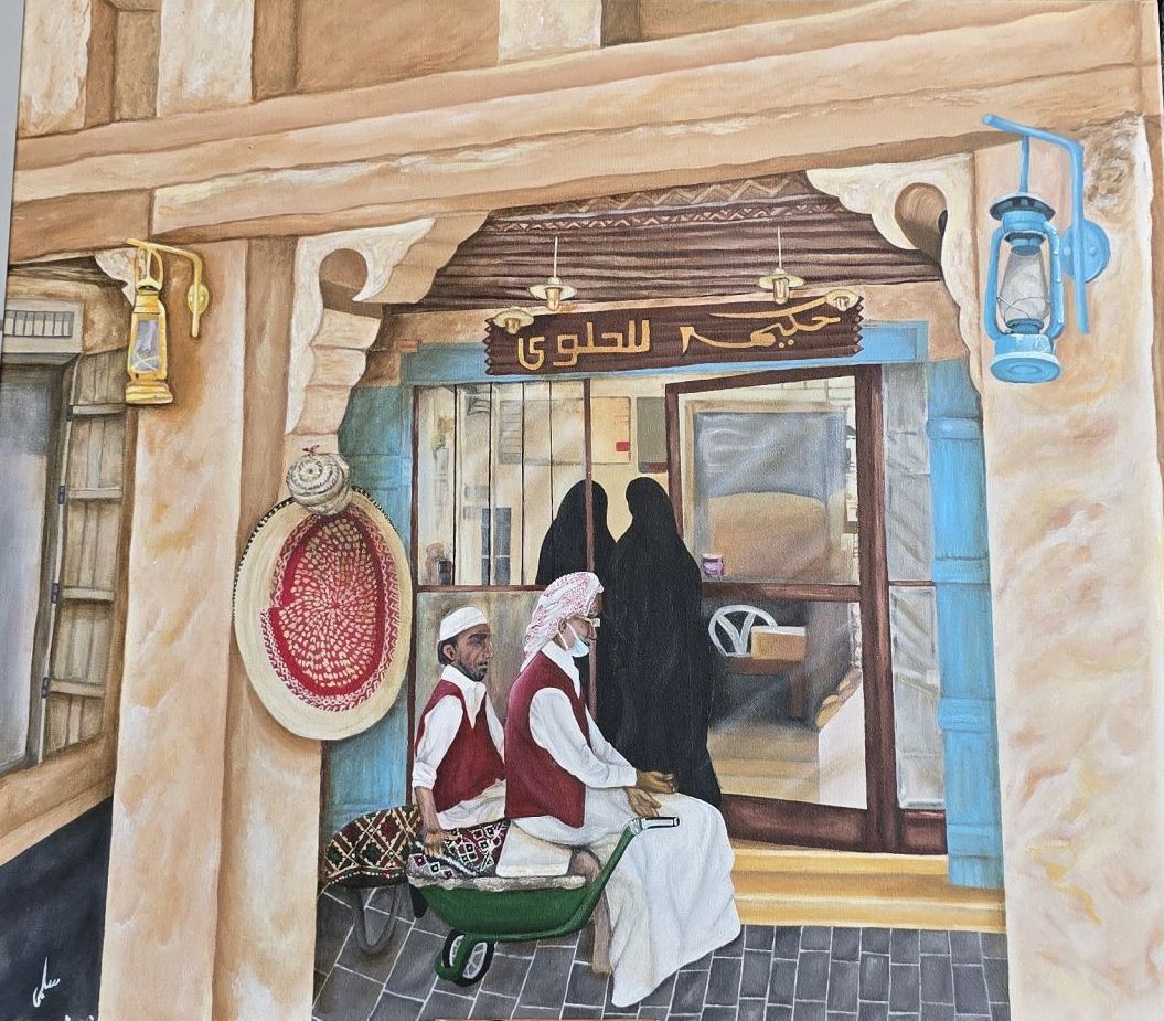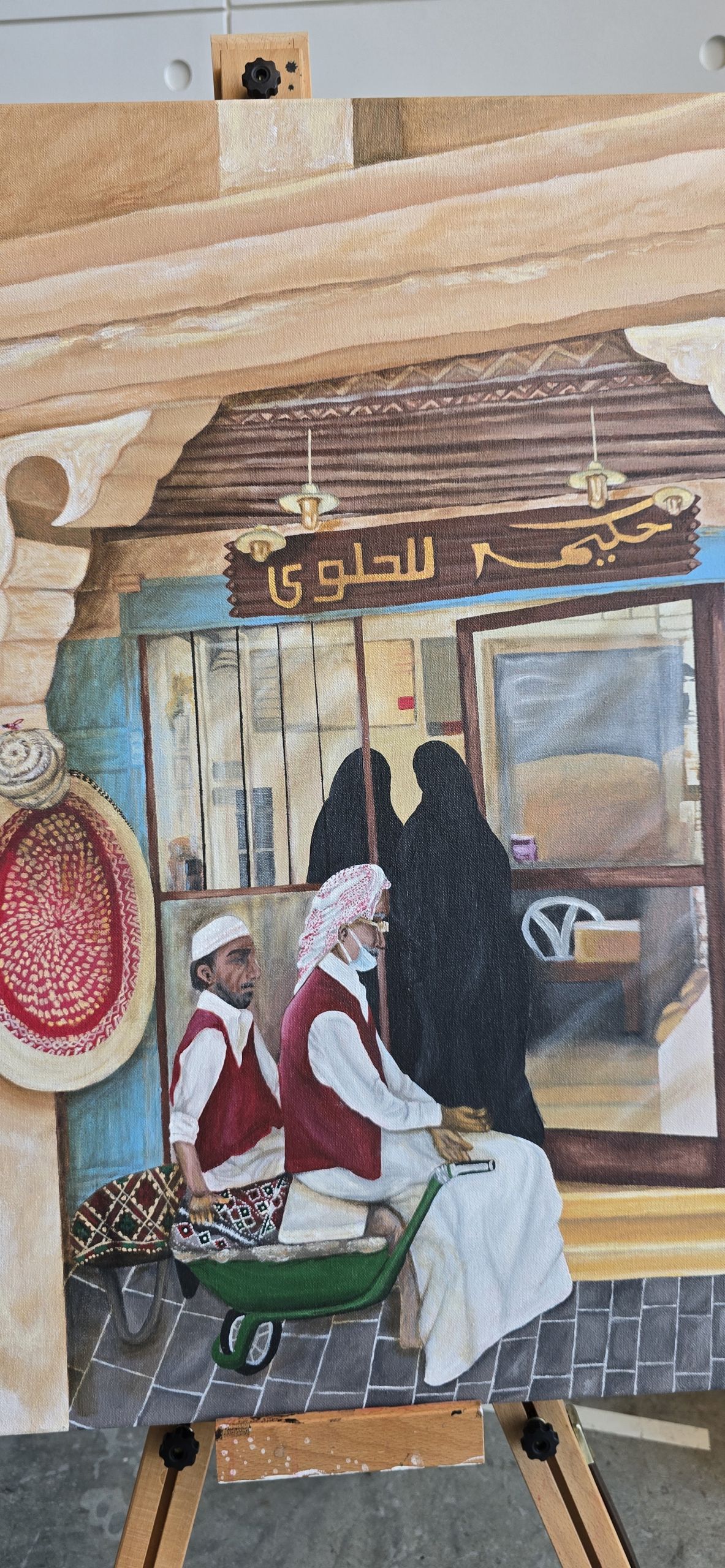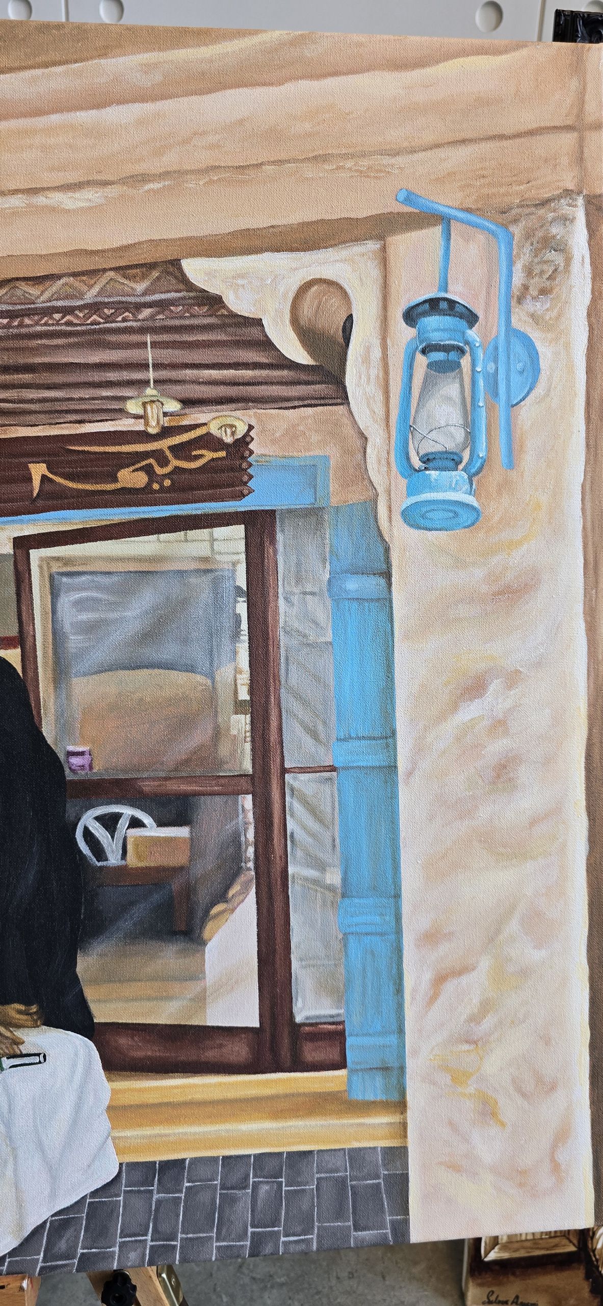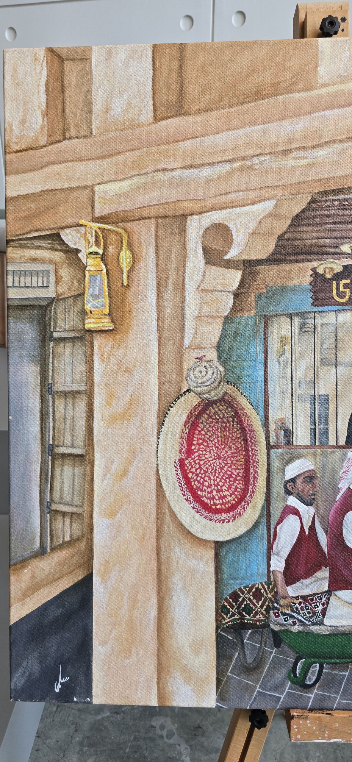 This artwork captures Hakim Sweets in Souq Waqif as a symbol of living heritage and collective memory. By assembling multiple photographic perspectives into a single composition and reinterpreting them through acrylic painting, the artist transforms a familiar commercial space into a layered visual narrative. The overlapping angles reflect the rhythm of daily life in the souq movement, repetition, and continuity while emphasizing the shop as a cultural landmark rather than a single moment in time. The work explores how places of everyday exchange become repositories of memory, tradition, and identity, preserving the spirit of the market through a contemporary artistic lens.
