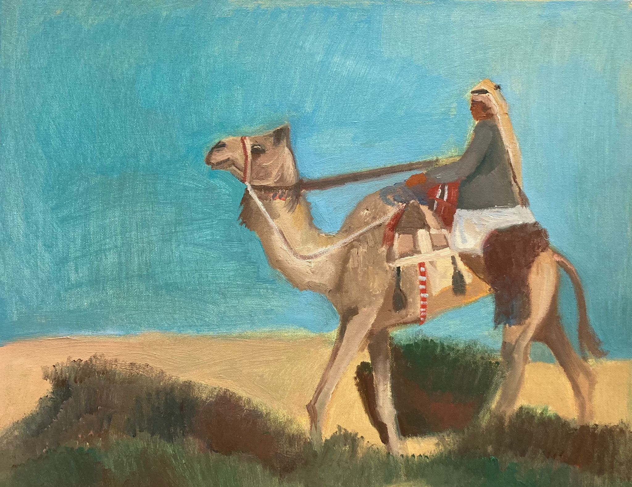 reflects a moment of lived heritage, capturing the close relationship between people, land, and tradition in the desert environment. The camel and rider move calmly through an open landscape, symbolizing endurance, guidance, and the continuity of ancestral knowledge passed through generations. The simplified forms and open sky create a sense of freedom and balance, while the traditional attire and camel gear anchor the scene firmly in cultural memory. Rather than depicting nostalgia, the artwork presents heritage as a living presence quiet, steady, and deeply woven into everyday life honoring the values of resilience, movement, and belonging that continue to shape identity in the region.