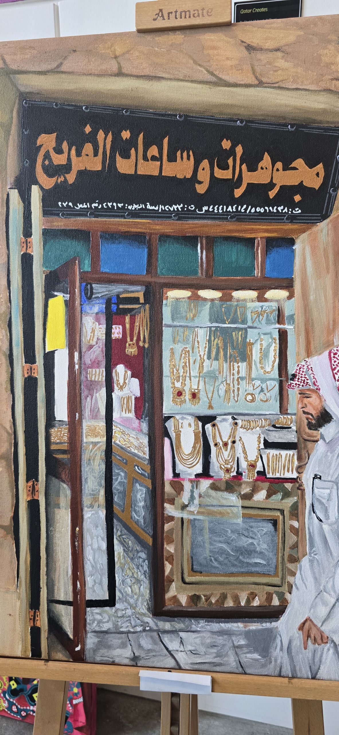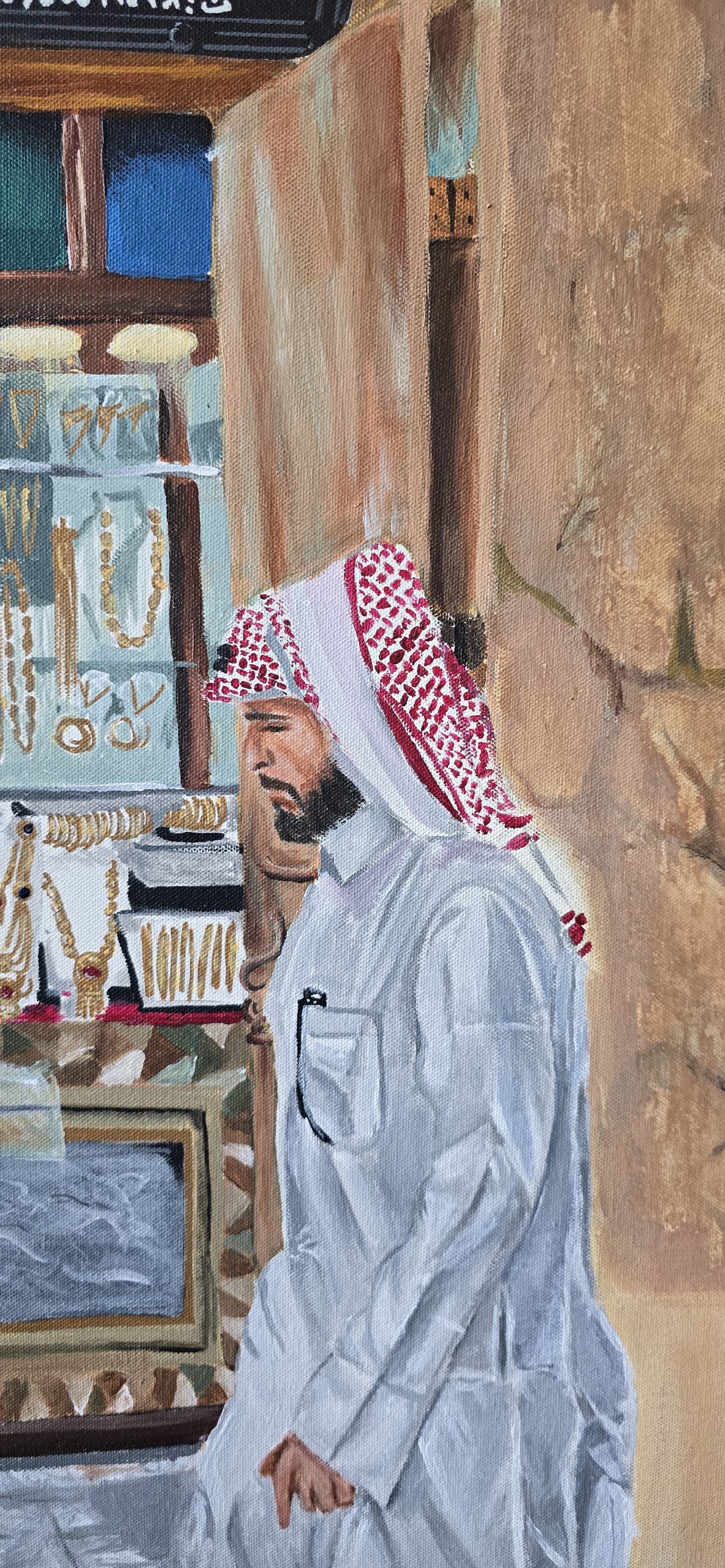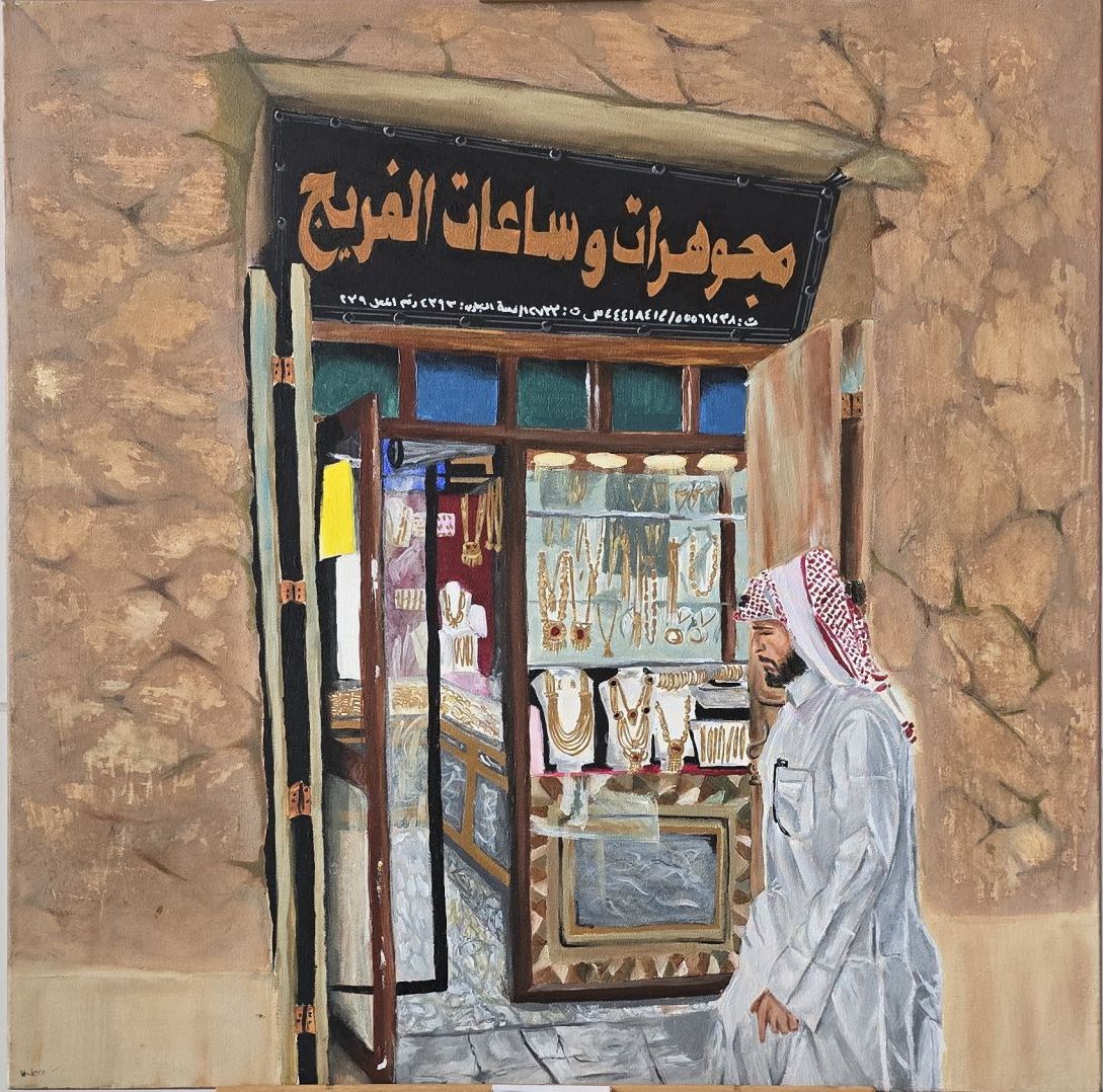 This painting depicts a traditional jewelry shop, with a man wearing Gulf attire standing in front of it. The scene reflects a moment from Souq Waqif, capturing the atmosphere of traditional commerce and local culture.